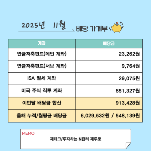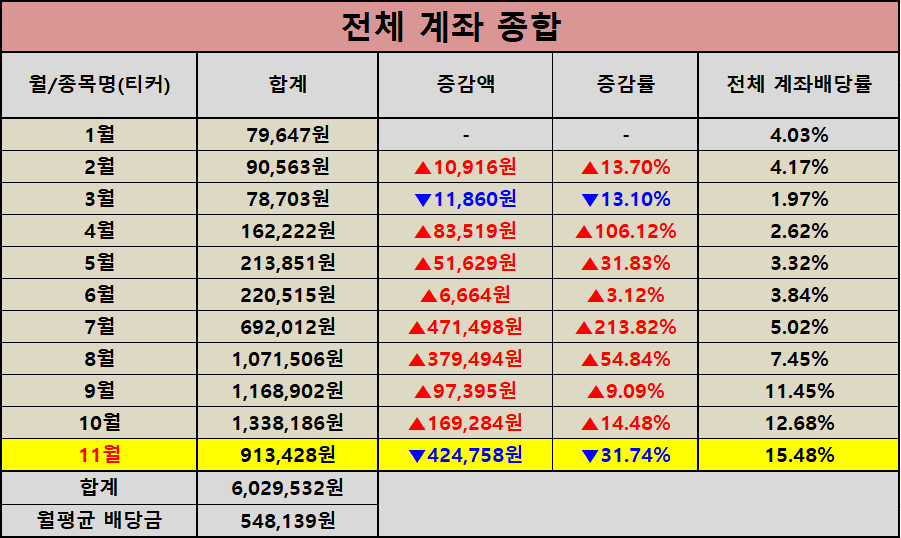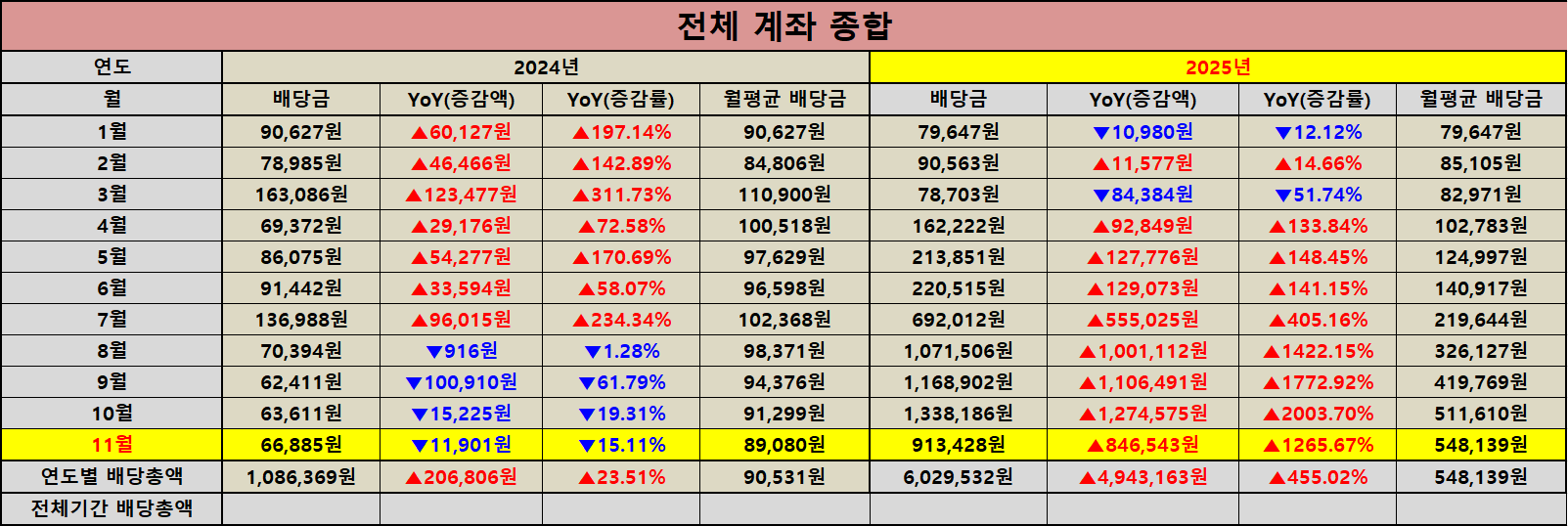 전체 계좌의 11월 배당금은 913,428원으로 지난해 같은 달보다 846,543원이 늘어나며 1,200%가 넘는 성장률을 기록했습니다. 네 개 계좌의 흐름이 합쳐지면 단일 계좌보다 훨씬 완만하고 안정적인 곡선을 그리기 때문에 꾸준한 자산 축적 구조가 더욱 잘 드러났습니다. 연간 누적 배당금도 6,029,532원을 넘어섰고 월평균 배당금은 548,139원으로 올라오면서 포트폴리오의 현금흐름 중심 전략이 점차 자리를 잡아가고 있었습니다.