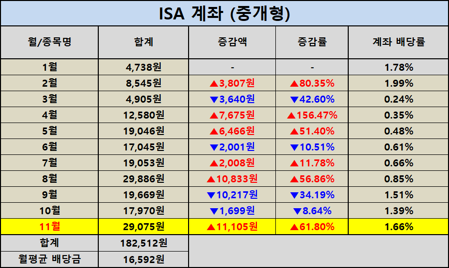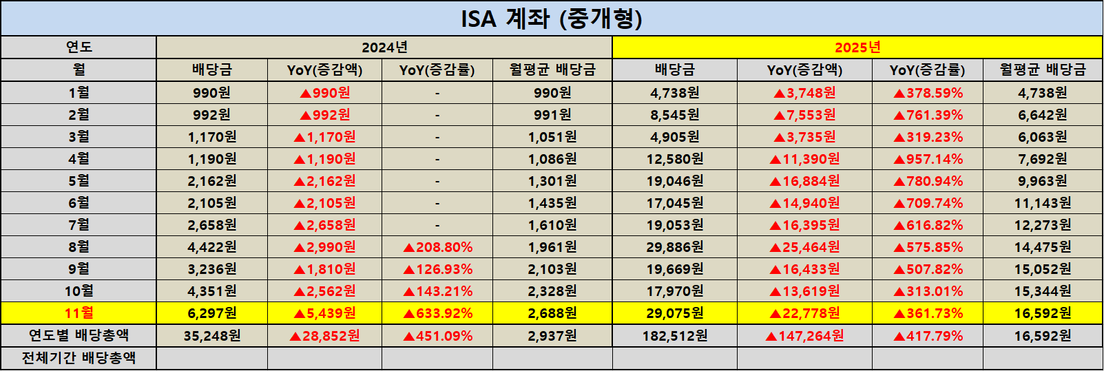 ISA 절세 계좌는 특히 눈에 띄는 흐름이었습니다. 이번 달 29,075원을 기록하며 전년 대비 22,778원이 증가했고 성장률은 360%를 상회했습니다. 이는 분산된 ETF 배당 구조와 절세 장점이 결합된 결과로 보이며 월평균 배당금도 16,592원까지 올라 꾸준한 성장 기반을 보여주었습니다.