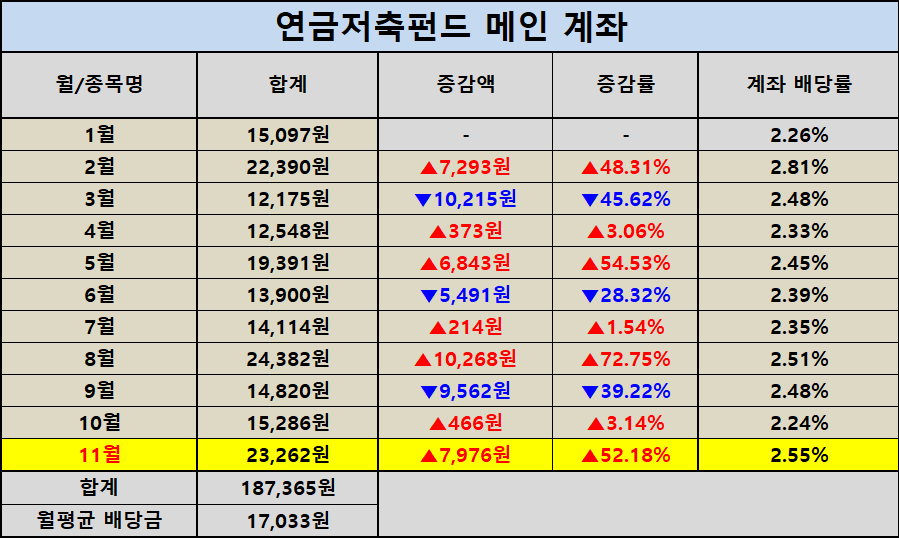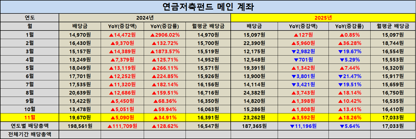 연금저축 메인 계좌는 11월 배당금이 23,262원으로 전년 대비 3,592원 증가하며 18%대 성장률을 기록했습니다. 월평균 배당금도 17,033원까지 올라와 연간 흐름이 한층 안정적으로 자리 잡히는 모습이었습니다. 매달 크고 작은 편차는 있었지만 전체적으로는 흔들림 없는 우상향이 이어졌고 적립식 매수와 배당 재투자의 힘이 서서히 반영되는 구간이라고 느꼈습니다.