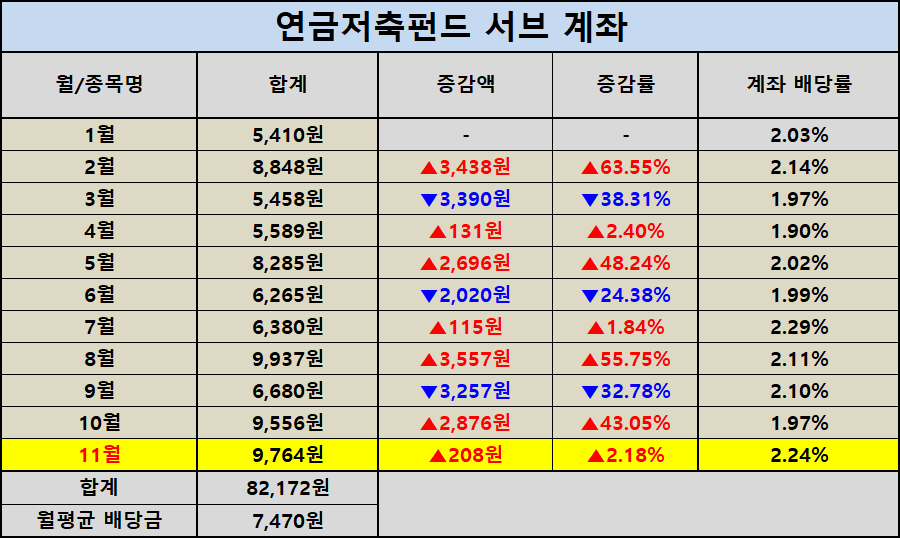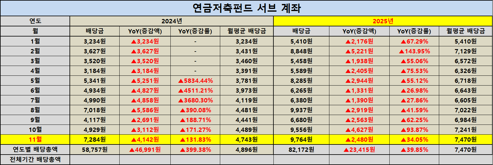 서브 계좌도 마찬가지로 9,764원을 기록하며 전년 대비 34% 성장했습니다. 상대적으로 규모가 작은 계좌임에도 배당 기반이 조금씩 넓어지고 있다는 점이 의미 있게 다가왔습니다. 월평균 배당금이 7,470원까지 상승하면서 연금 계좌 전반의 현금 흐름이 더욱 단단해지고 있다는 점을 확인할 수 있었습니다.