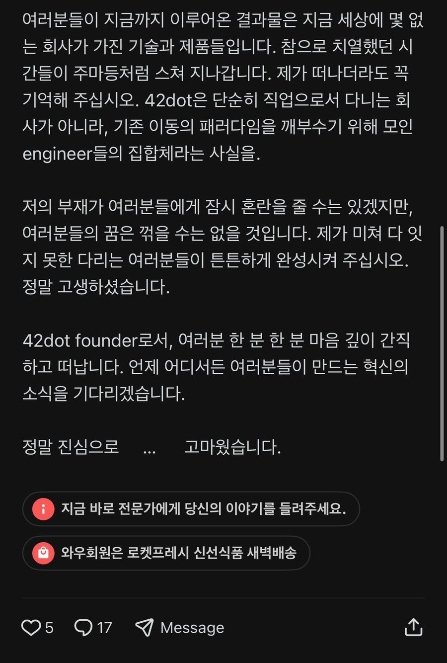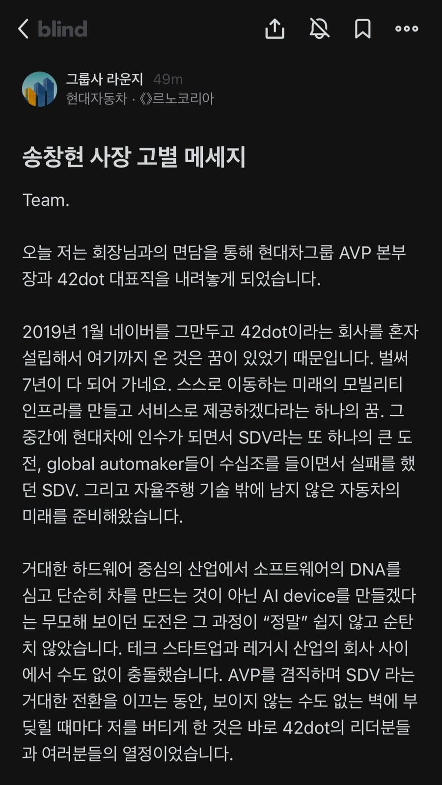 6년 넘게 포티투닷을 이끌던 송창현 사장은 결국 자리를 내려놓았네요.