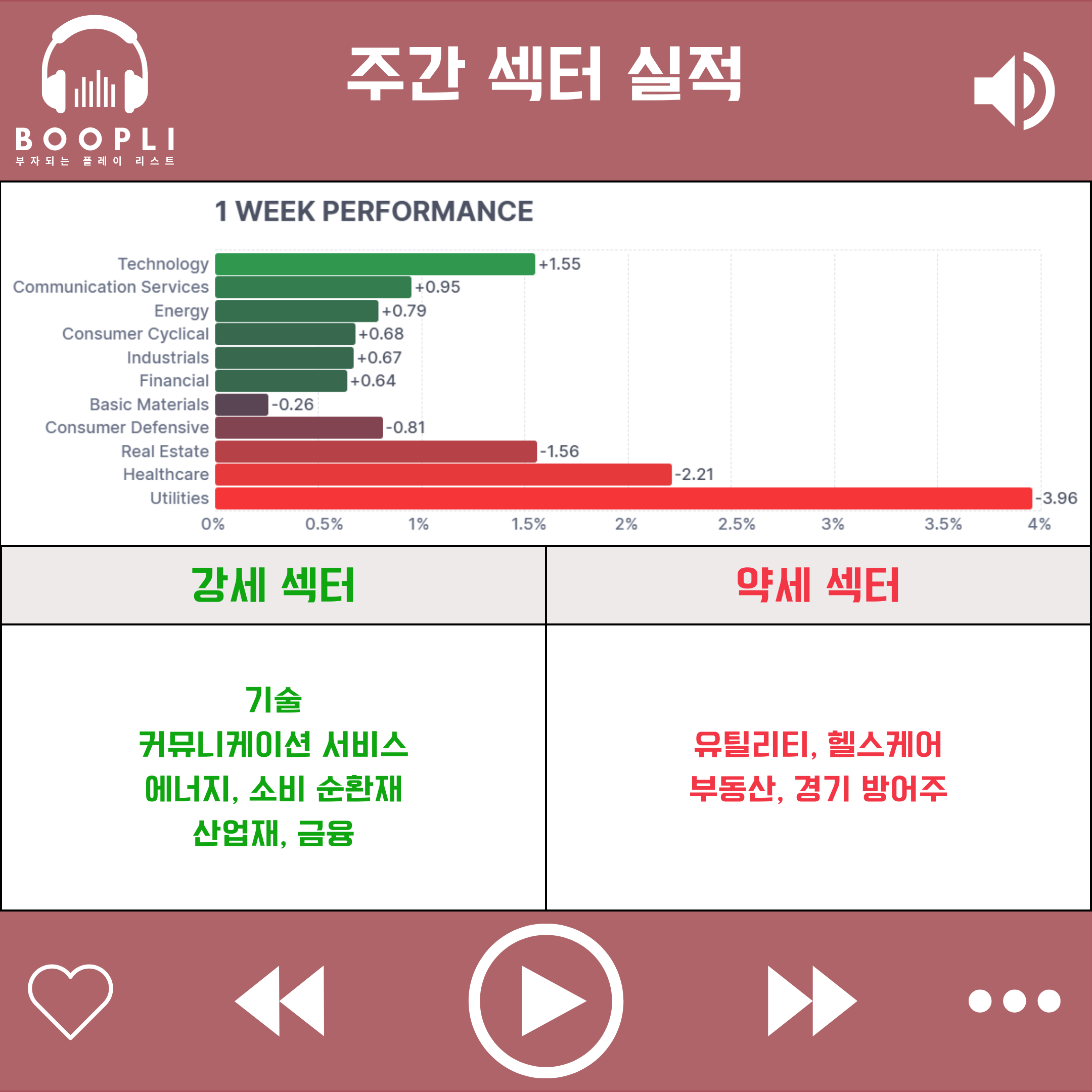 이번 주에는 젠슨 황 엔비디아 CEO의 발언으로 AI 모멘텀이 되살아나며 기술 섹터가 상승을 주도했고, 이어서 커뮤니케이션 서비스, 에너지, 소비 순환재, 산업재, 금융 순으로 강세를 보였다.