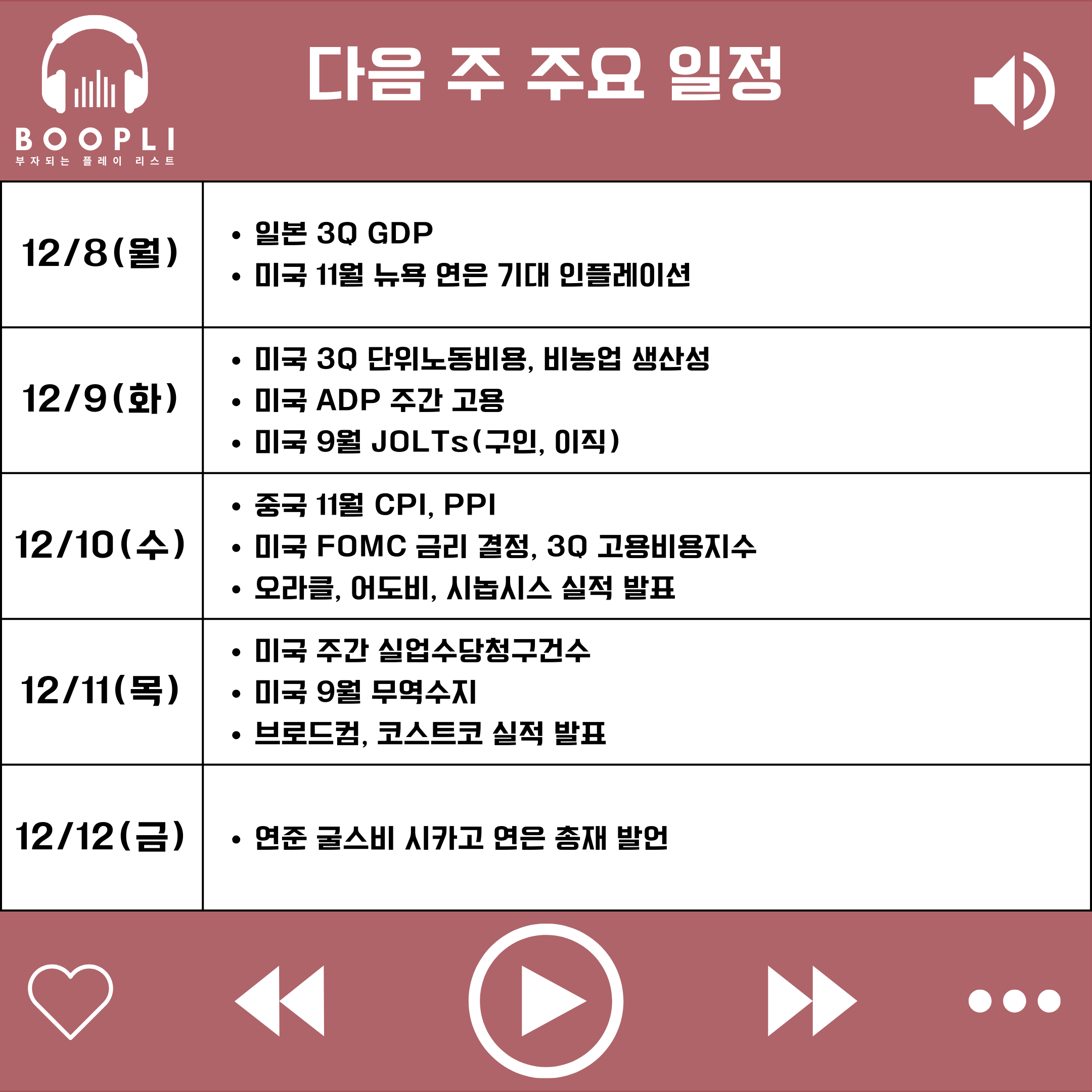 기업 측면에서는 최근 부채 부담이 부각된 오라클의 실적 발표와, 구글의 TPU 칩 제조에 참여하는 브로드컴의 실적이 AI 모멘텀과 관련 성장주 흐름에 영향을 줄 가능성이 높다.