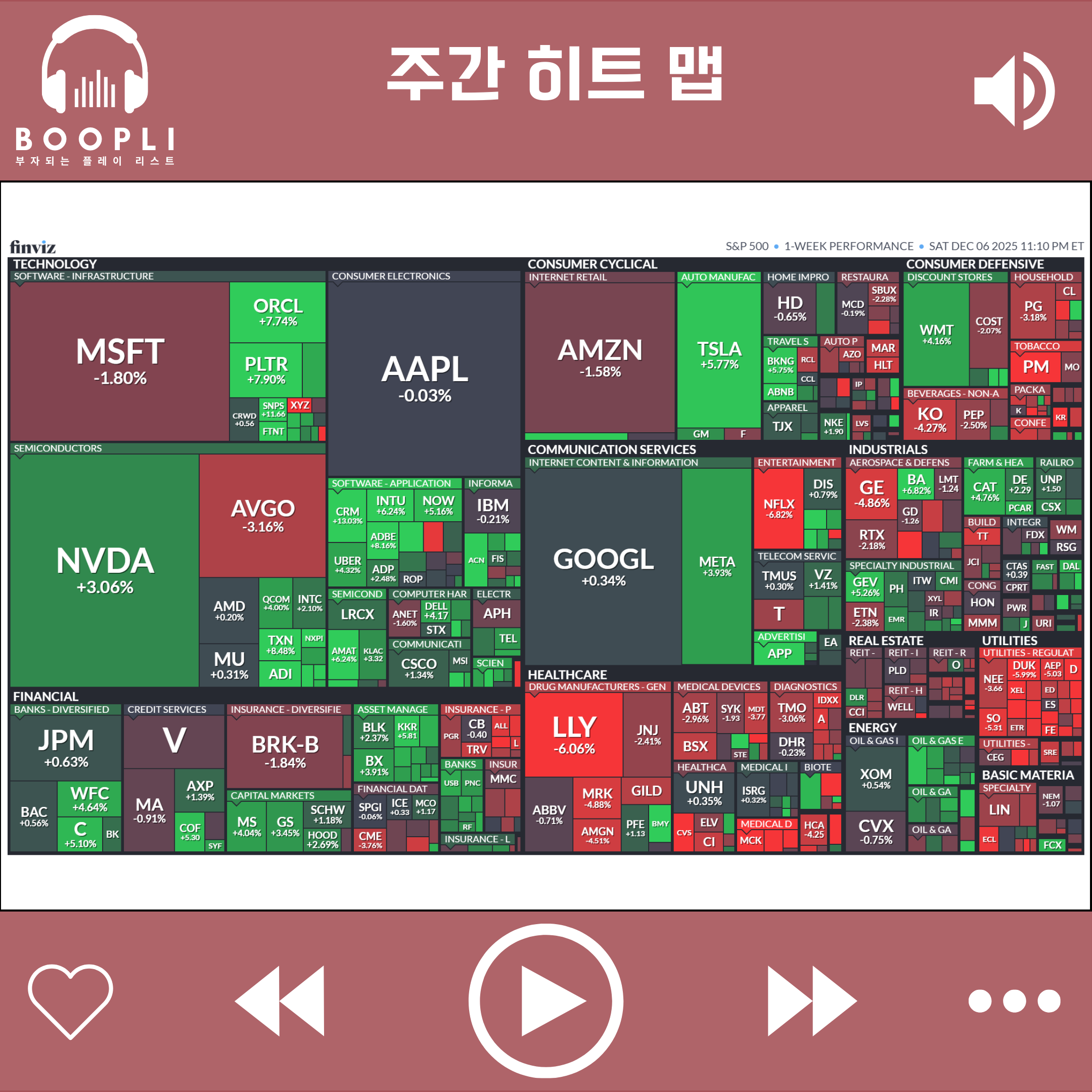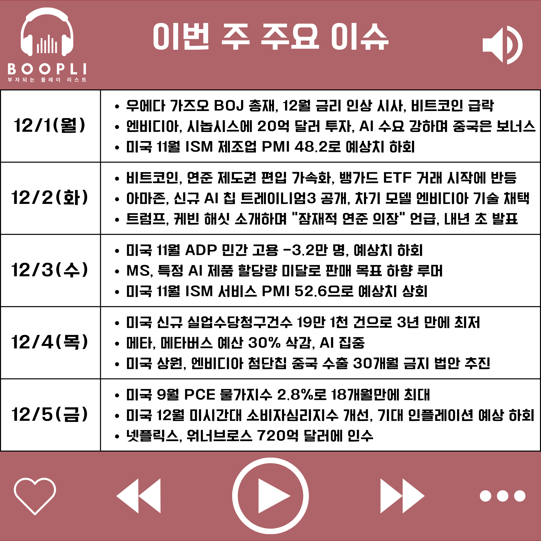 이번 주 증시는 일본 금리 인상 가능성 부각, 젠슨 황 엔비디아 CEO 발언, 기업 실적 발표, 워너브로스 인수 등 이슈에 따라 차별적인 모습을 보였다.
