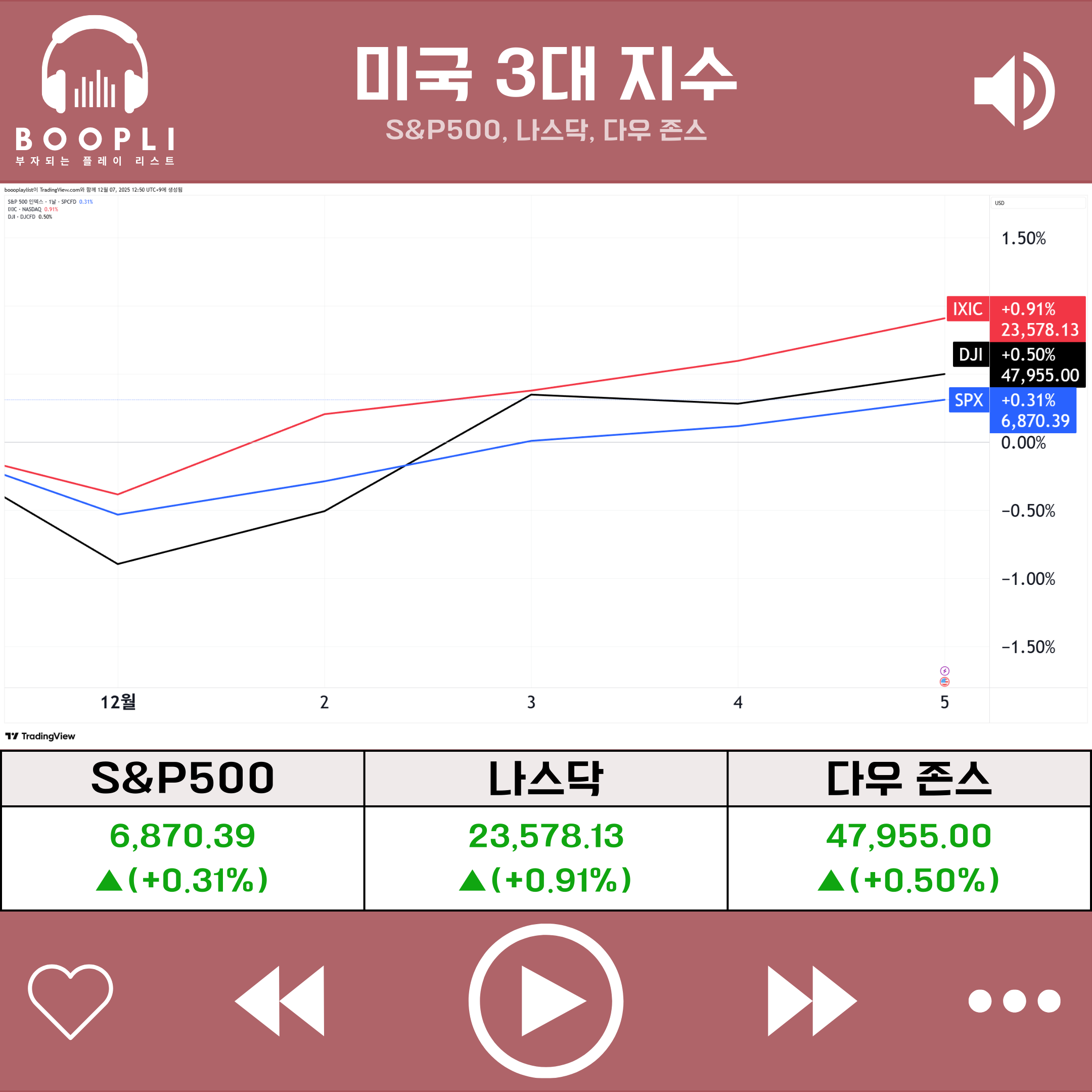 이번 주 미국 증시는 일본은행(BOJ)의 금리 인상 우려와 비트코인 급등락, 주요 경제 지표 결과가 복합적으로 작용하며 높은 변동성을 보였으나, 연준의 12월 금리 인하 기대감이 유효하게 작용하며 3대 지수 모두 소폭 상승세로 마감했다.