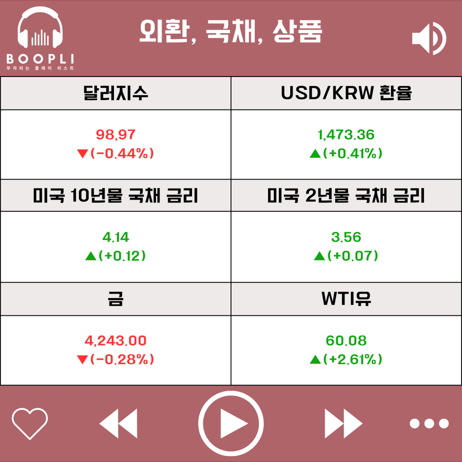 국채 금리 상승으로 안전자산인 금 가격은 하락했고, 우크라이나 종전 협상 교착으로 국제 유가인 WTI유 가격은 상승했다.
