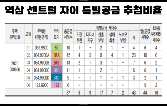 총 공급 87세대 중 특별공급이 43세대, 일반공급이 44세대이며 면적별/가점 추첨제 비율이 적용된다. 신혼부부 특별공급의 경우 소득조건과 자산조건이 붙으며 신용대출 1억 이상인 차주는 해당 지역에 주택매수가 불가능하다. 투기과열지구라 추첨제 물량도 적고 1주택자가 청약 넣을 수 있는 물량도 84A밖에 없다. 추첨제란 이름만 허울이고 사실상 있는 사람만 청약을 넣을 수 있는 제도이다. 이런 규제는 양극화만 극대화하며 서민들을 위하는 척 하지만 결국 오히려 기득권층 끼리끼리 해먹는 사업이다.