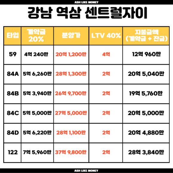 계약금은 20%, 중도금은 60%(60% 중 40% 밖에 대출이 되지 않는다), 15억 초과 25억 미만 아파트의 대출은 4억까지 줄어들고 25억 초과 아파트는 대출이 2억까지 밖에 안 된다. 그렇기에 왠만한 현금이 없으면 청약이 안 된다. 주변 59타입 시세가 32억, 84타입은 33.5억, 122타입은 48억이다.