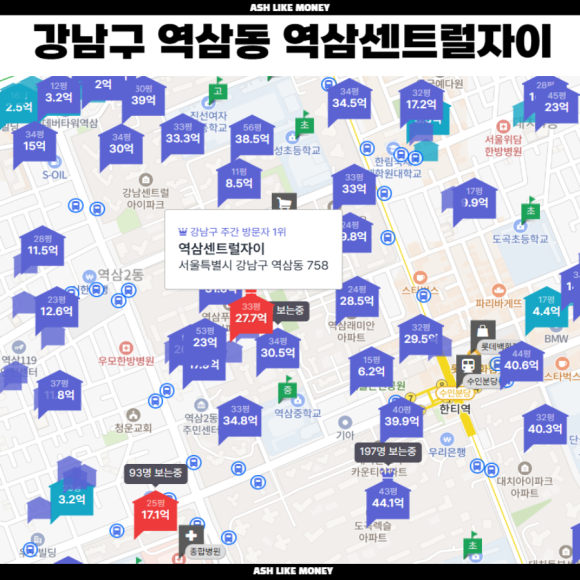 역삼동 센트럴자이는 은하수아파트를 재건축한 아파트로 총 237세대의 소규모 단지이다. 입주는 28년 8월 예정으로 한티역 초역세권이며 역삼중을 안고 있다. 2호선 선릉역은 도보 13분이고 한티역은 5분 안에 갈 수 있는 아파트이다. 브랜드에 신축이긴 하지만 대단지가 아니라 아쉬움이 남는 아파트이기도 하다. 대신, 분양가상한제 덕에 분양가가 저렴하게 나왔다. 분당 티에르원이 84타입 26억인데, 강남이 26~28억 수준이면 매우 저렴한 것이다. 바로 옆 아파트들도 40억 수준이기에 시세차익은 10억 이상이다.