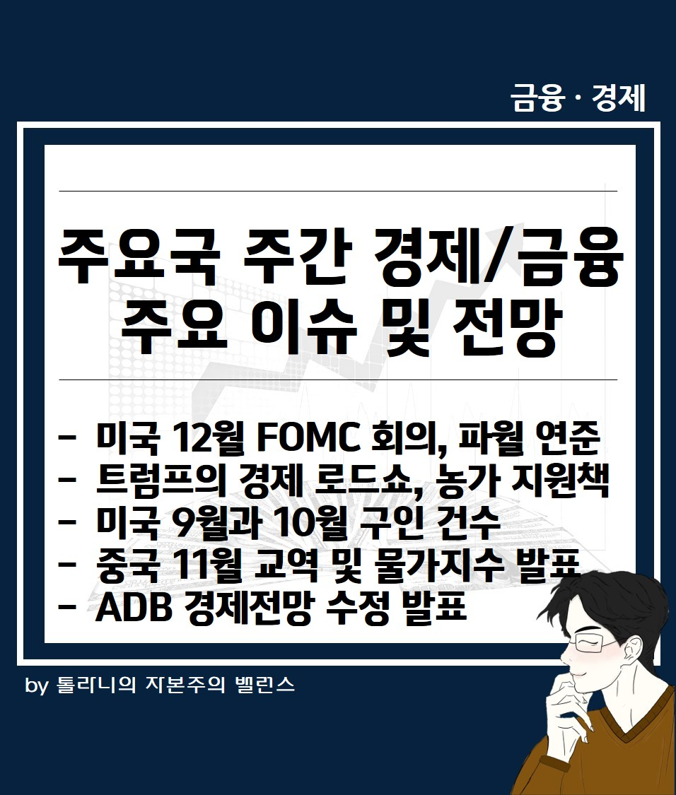 이에 '미국 12월 FOMC 회의 금리결정, 파월 연준 의장 연설 등 주요 국가 주간 경제·금융 일정 및 이슈' 관련하여 언론 보도 및 국제금융센터 보고서를 통해 좀 더 자세히 알아보도록 하겠습니다.