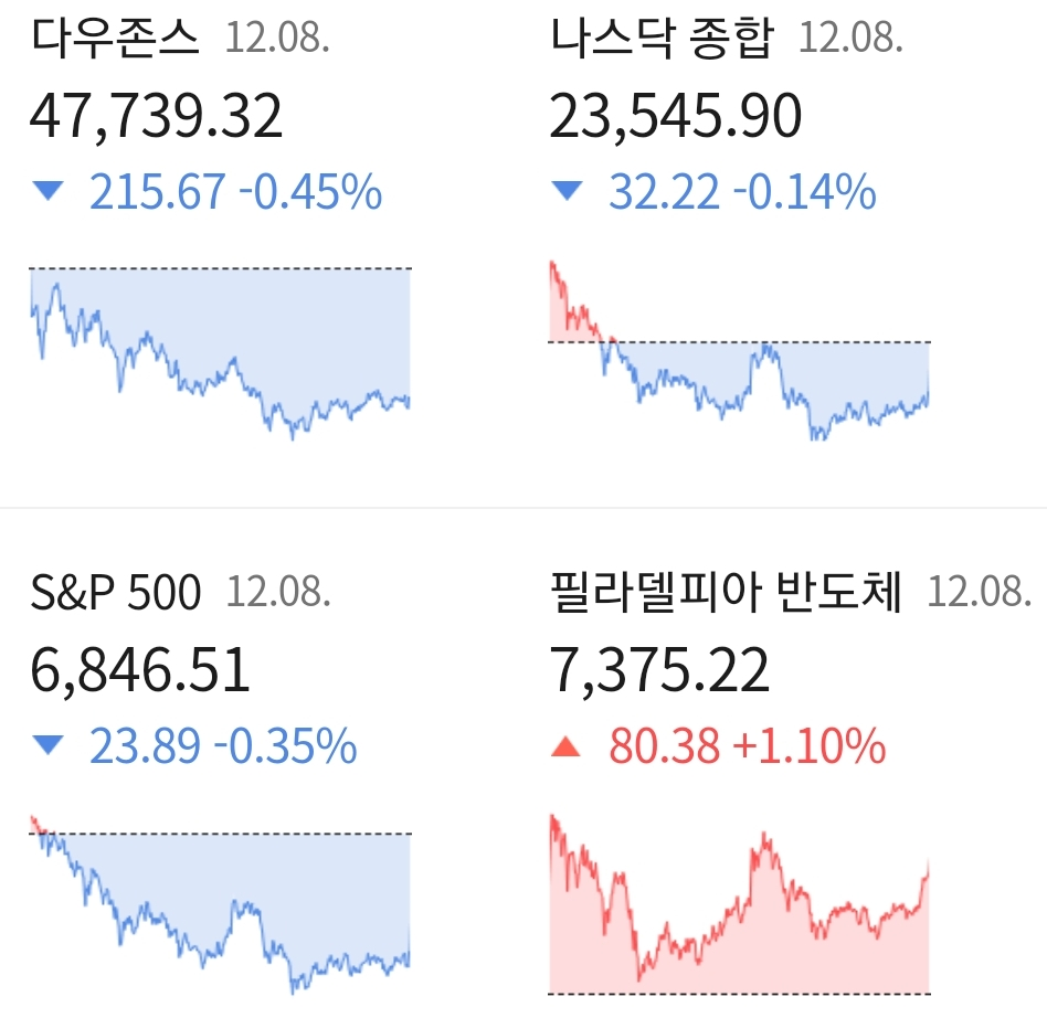 다우지수는 전일 대비 -0.45% 하락한 47,739.32에 거래를 마쳤으며, 대형주 중심의 S&P500 지수는 전장 대비 -0.35% 떨어진 6,846.51에 장을 마감하였습니다. 기술주 중심의 나스닥 지수는 전 거래일 대비 -0.14% 하락한 23,545.90에 거래를 마치며 장을 마감하였습니다.