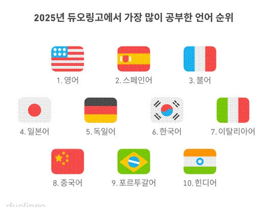 2025년 듀오링고 앱에서 전 세계인들이 학습하는 언어 순위로는 영어, 스페인어, 불어, 일본어, 독일어, 한국어, 이탈리아어, 중국어, 포르투갈어, 힌디어입니다.