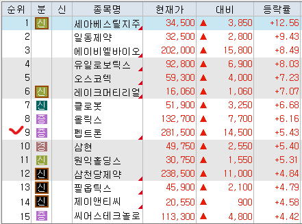 비만치료제 성장 기대감에 비만치료제 테마가 상승하고, 금리인하 기대감에 바이오 제반 업종이 오름세를 이어갔음(티앤알바이오팹 +19.38%, 퓨처캠 +8.82%, 에이비엘바이오 +8.49%, 펩트론 +5.43%)