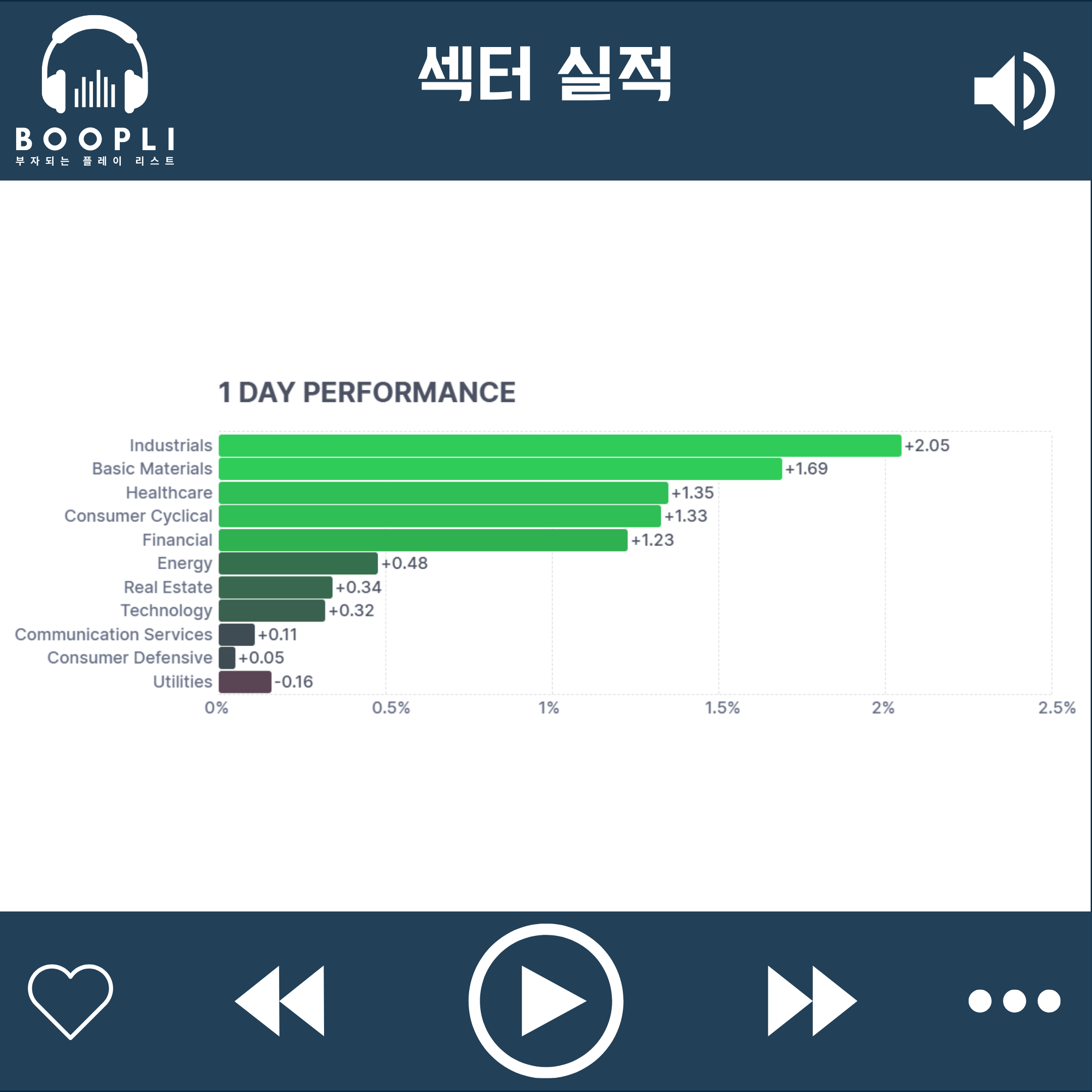 산업재 섹터가 상승을 주도했고, 원자재, 헬스케어, 소비 순환재, 금융 순으로 강세