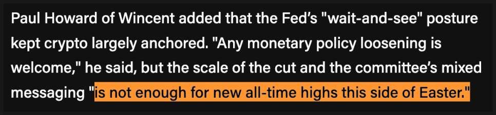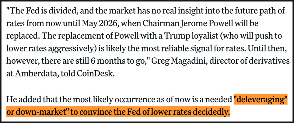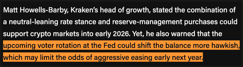 크라켄의 성장 총괄 매트 하웰스바비는 “현재의 신중한 금리 기조와 단기 유동성 공급 조치가 합쳐지면 2026년 초까지는 시장을 받쳐줄 수 있다”고 분석했습니다. 다만 내년 초 연준 위원 교체가 이뤄지면 더 매파적인 구성이 될 수 있다는 점을 경고했고, 금리 인하 속도가 느려질 가능성을 의미합니다.