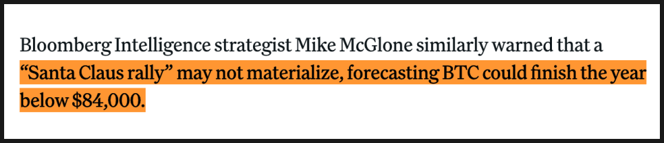 블룸버그 인텔리전스의 마이크 맥글론은 한 발 더 나아가서, 올해는 ‘산타 랠리’가 나오지 않을 가능성을 언급했는데요. 심하면 비트코인이 연말을 8만4천 달러 밑에서 끝낼 수도 있다는 전망입니다.