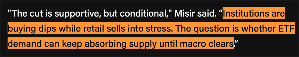 결국 흥미롭게도 현재 비트코인은 단기적으로 봤을 때 개인들의 매도 흐름이 여전히 강해서 좁은 박스권 안에 갇혀 있는 상태인데요. 기관의 경우 가격이 떠렁질 때마다 매수를 하는 흐름이 확인되고 있어, 비트코인 ETF가 이 매도 물량을 얼마나 받아낼 수 있느냐가 단기 시장을 결정할 것으로 보인다는 의견이 나오고 있습니다.