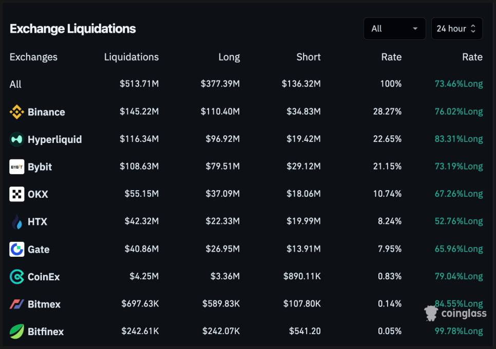 한편 이번 조정 과정에서 가장 눈에 띄는 건 레버리지 포지션이 대거 정리됐다는 점입니다. 지난 24시간 동안 무려 5억 달러가 넘는 계약이 한꺼번에 청산되면서, 시장 전체가 강한 흔들림을 겪었는데요. 이 가운데 약 3억 7천만 달러 규모가 롱 포지션 청산이었다고 합니다. 즉, 대부분의 투자자들이 상승 쪽에 너무 많이 기울어져 있었고, 그 기대가 무너지는 순간 순식간에 포지션이 터진 셈입니다.