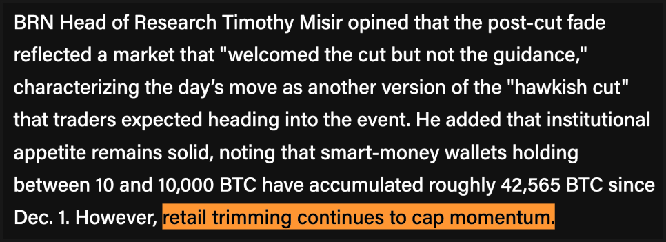 게다가 스마트머니로 분류되는 10 BTC에서 1만 BTC를 들고 가는 큰 지갑들이 12월 들어 약 4만2천 개의 비트코인을 더 매집했다고 합니다. 기관은 명확하게 ‘저점 매수’ 흐름에 들어간 건데요. 반대로 단기 보유자들과 개인 투자자들은 시장이 흔들릴 때마다 매도를 늘리고 있습니다. 그래서 기관이 사더라도, 개인의 매도가 상승 에너지를 계속 눌러버리는 구조가 만들어지고 있습니다.
