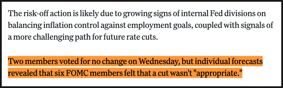 첫째, 연준 내부 의견이 꽤 갈렸습니다. 전해진 바에 따르면 이번 연준 회의에서 두 명은 금리 동결을 원했고, 6명의 FOMC 위원이 이번 인하가 적절하지 않다고 판단했다고 합니다. 그만큼 경기와 물가에 대한 해석이 갈리고 있다는 뜻이죠.