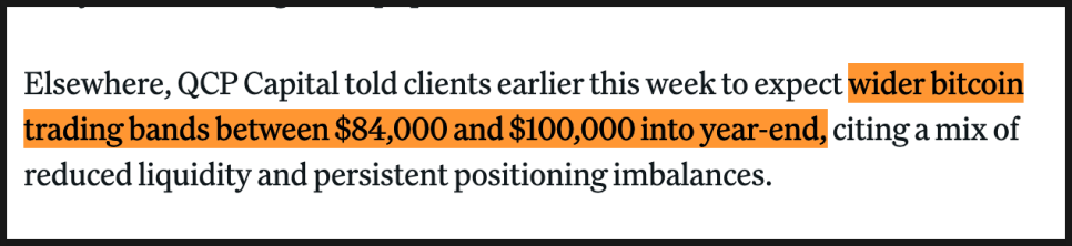 QCP 캐피털도 이미 이번 주 초에 투자자들에게 “연말까지 비트코인 박스권이 더 넓어질 수 있다”고 경고했습니다. 범위는 8만4천에서 10만 달러 정도로 예상했고, 그 이유로는 유동성 감소와 포지션 쏠림을 들었습니다.