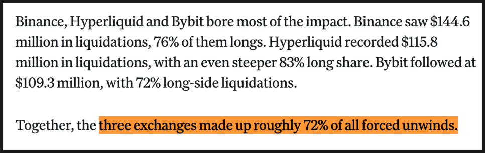 청산 규모를 보면 15만 명이 넘는 투자자들이 한 번에 정리됐습니다. 가장 큰 단일 청산은 하이퍼리퀴드(Hyperliquid)에서 발생한 2천3백만 달러 규모의 비트코인 포지션이었고요. 특히 영향이 컸던 거래소는 바이낸스, 하이퍼리퀴드, 바이비트였습니다.