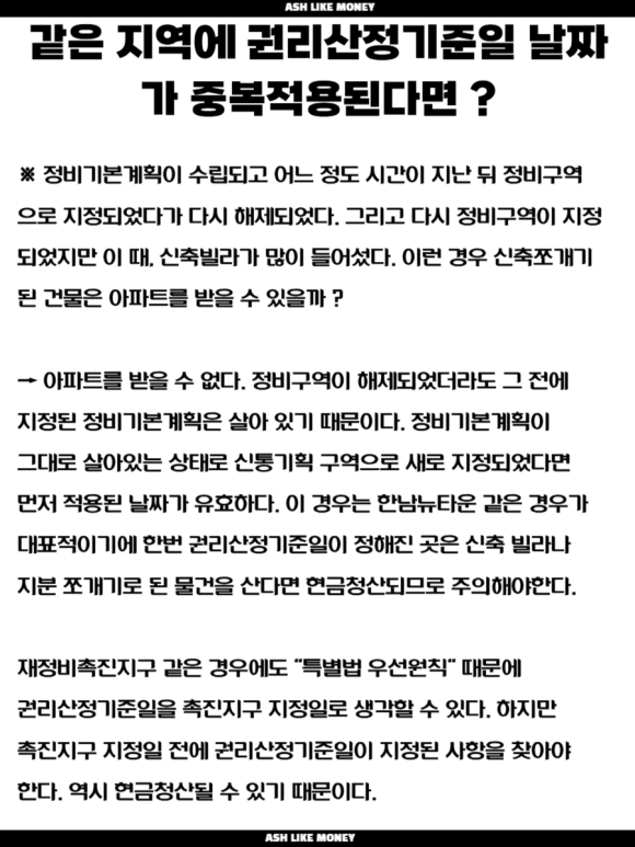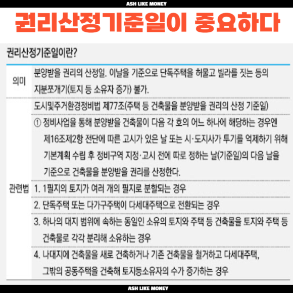 하지만 이런 쪼개기가 된다면, 재개발 필수요건인 노후도가 점점 낮아지고 조합원 수가 늘어나서 기존의 선량한 조합원들은 피해를 받는다. 그래서 "권리산정일"을 통해 아파트를 추가로 받을 수 있는 권리를 막는다.