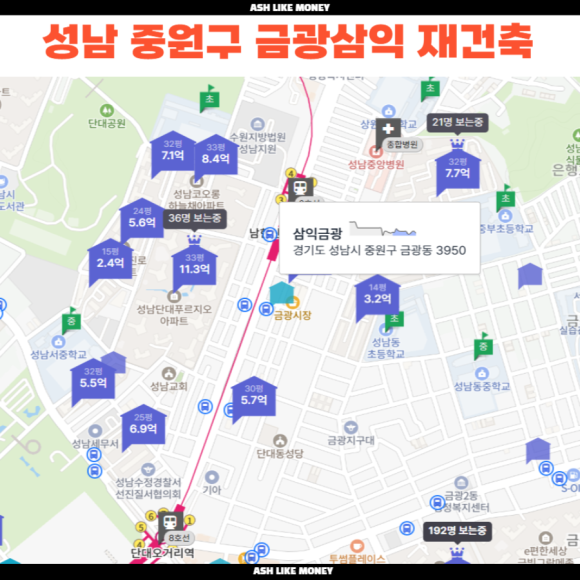 기회의 땅, 구성남은 이제 25평 신축 아파트의 시세는 10억 이상이다. 어수선하고 노후화된 곳이 많던 성남 구시가지이지만, 분당구, 잠실 밑이라는 엄청난 입지 덕에 개발이 계속 진행 중이다. 게다가 성남시장 역시 재개발에 관심이 많아 주도적으로 개발을 이끌고 있다. 구성남은 중원구, 수정구로 이루어지고 수인분당선 + 8호선의 수진동, 태평동이 재개발 된다면 최고의 입지이지만, 중원구 산성동 역시 산성역이 잠실과의 거리가 더 가깝기에 현재 대장은 산성동의 포레스티아이다. 게다가 LH와 함께 순환방식으로 재건축/재개발이 진행되는 곳이 구성남이고 그 중 하나가 금광동 금광삼익이다.