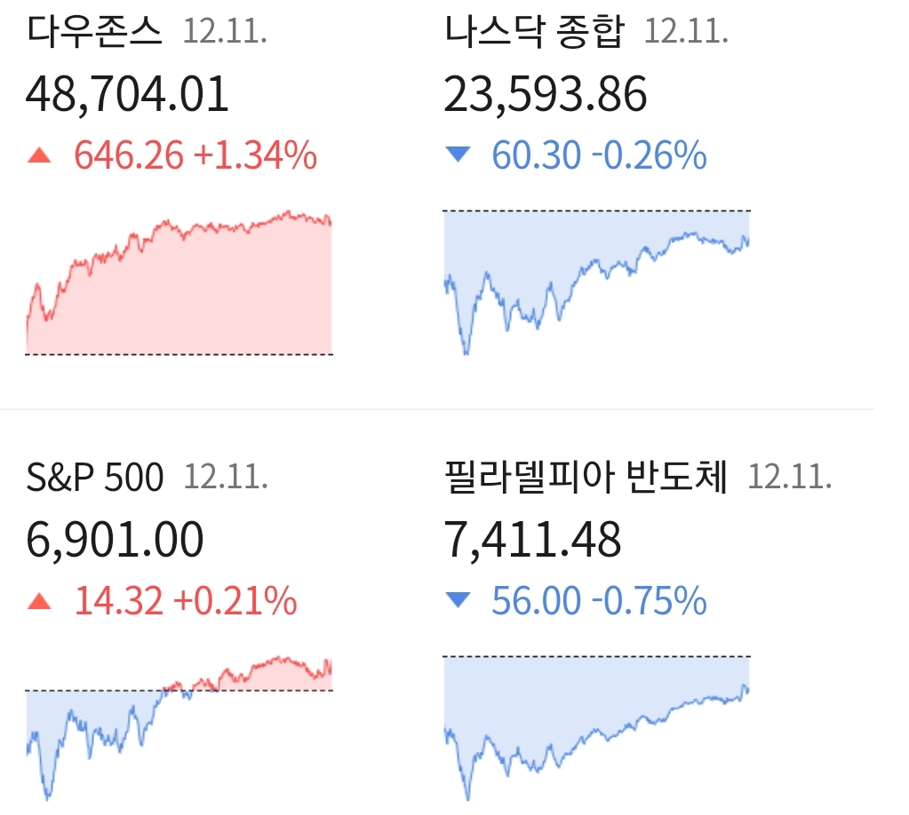 다우지수는 전일 대비 +1.34% 오른 48,704.01에 거래를 마쳤으며, 대형주 중심의 S&P500 지수는 전장 대비 +0.21% 상승한 6,901.00에 장을 마감하였습니다. 기술주 중심의 나스닥 지수는 전 거래일 대비 -0.26% 하락한 23,593.86에 거래를 마치며 장을 마감하였습니다.