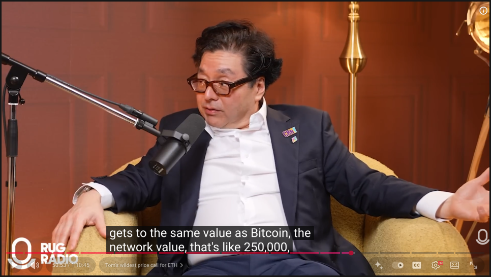이 과정에서 톰 리는 이더리움 가격을 생각하는 간단한 프레임 두 개를 제시합니다. 첫 번째는 비트코인 대비 비율입니다. 과거 평균 ETH/BTC 비율이 대략 0.08 정도였고, 만약 장기적으로 비트코인이 20만 달러까지 간다고 가정하면, 이 비율만 과거 수준으로 회귀해도 이더리움은 1만6천 달러 수준이 됩니다. 두 번째는 네트워크 가치가 비트코인과 비슷하거나 그 이상으로 평가되는 시나리오입니다.