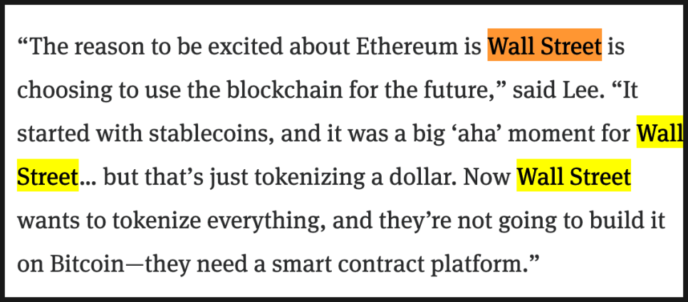 그 이유는 월가가 선택한 블록체인이 이더리움이라는 점을 강조했습니다. 최초에는 스테이블코인 발행처럼 비교적 단순한 활용이 먼저 시작됐지만, 지금은 월가가 모든 자산을 토큰화하려는 방향으로 움직이고 있고, 이런 복잡한 금융 구조를 구현하려면 스마트 계약 기능이 필수죠. 그래서 비트코인보다는 이더리움 네트워크 위에서 금융 인프라를 쌓을 가능성이 높다고 보는 겁니다.