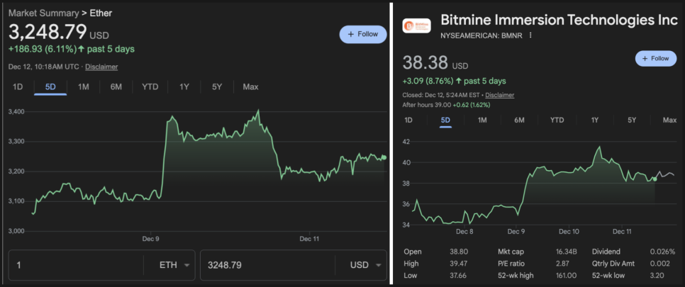 지난 5거래일 동안 이더리움 가격과 비트마인 주가는 각가 6%와 8.7% 상승했습니다. 12월 말, 1월 말, 그리고 내년 이맘때쯤엔 어떤 가격에 어떤 차트를 보여주고 있을지 궁금해집니다.