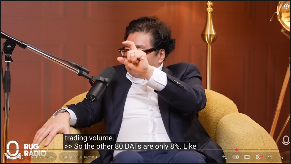 DAT, 그러니까 디지털 자산을 재무 구조에 크게 담는 상장 회사들에 대한 생각도 솔직합니다. 올해 초부터 지금까지 새로 나온 DAT가 80개 가까이 되는데, 이 가운데 90퍼센트 정도는 보유 자산 가치(NAV)보다 싸게 거래되고 있습니다. 거래대금을 기준으로 보면, 사실상 시장은 스트래티지(MSTR)와 비트마인(BMNR) 두 곳에만 집중되어 있고, 나머지 DAT들은 거의 무시당하는 수준입니다.