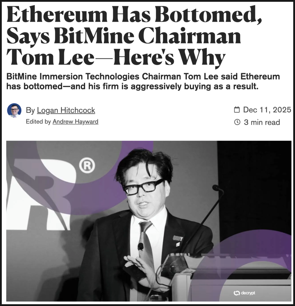 단기 변동성과 ‘바닥’에 대한 생각도 흥미롭습니다. 일단 톰 리는 인터뷰 말미에 “비트마인은 이더리움이 이미 바닥을 찍었다고 보고 있다”고 못 박습니다.