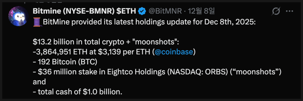 최근 채널에서 다룬 것처럼 세계에서 가장 큰 이더리움 보유 기업인 비트마인은 지난주에만 약 46억 달러 규모, 개수로는 13만 8천 개가 넘는 이더리움을 추가 매수했다고 하는데요. 비트마인이 올해 10월 20만 개를 샀을 때 이후 최대 규모입니다. 이 회사는 장기적으로 이더리움 유통물량의 5퍼센트를 확보하겠다고 말해 왔었죠.