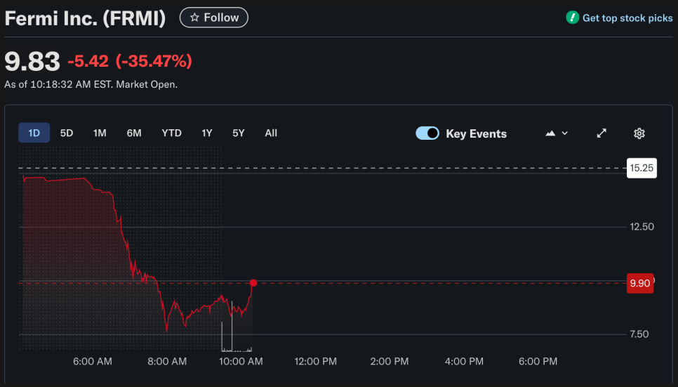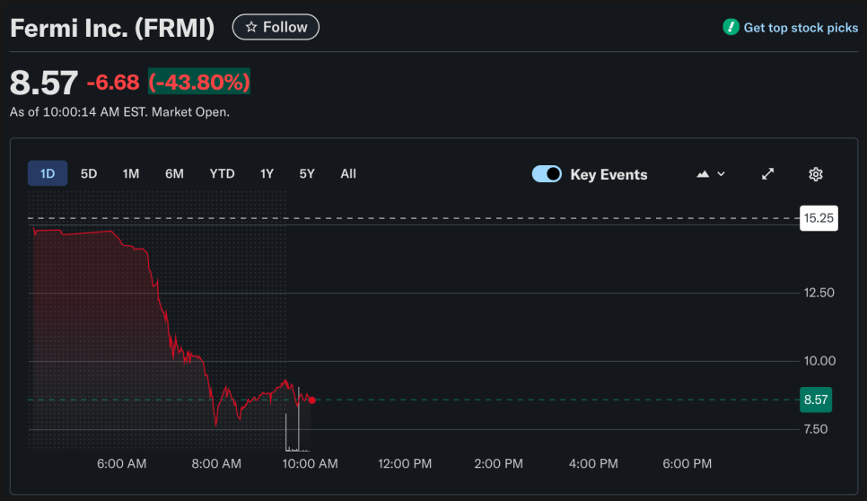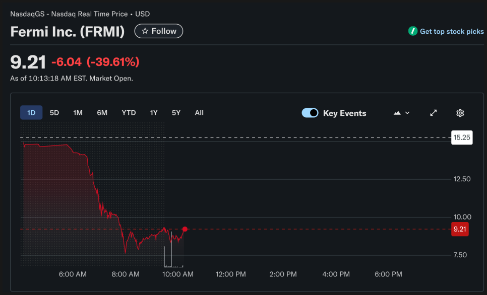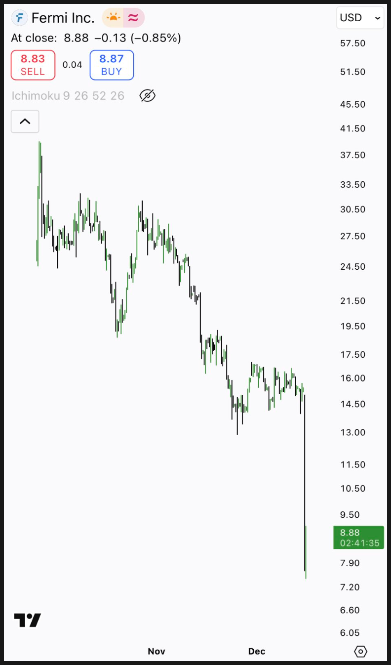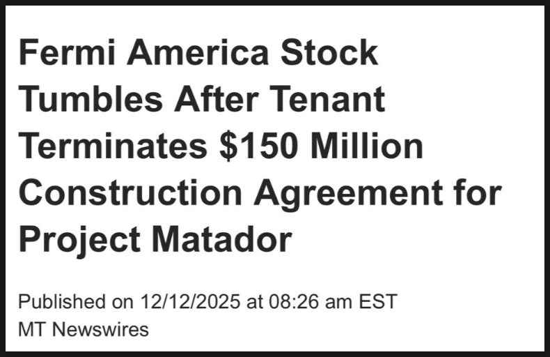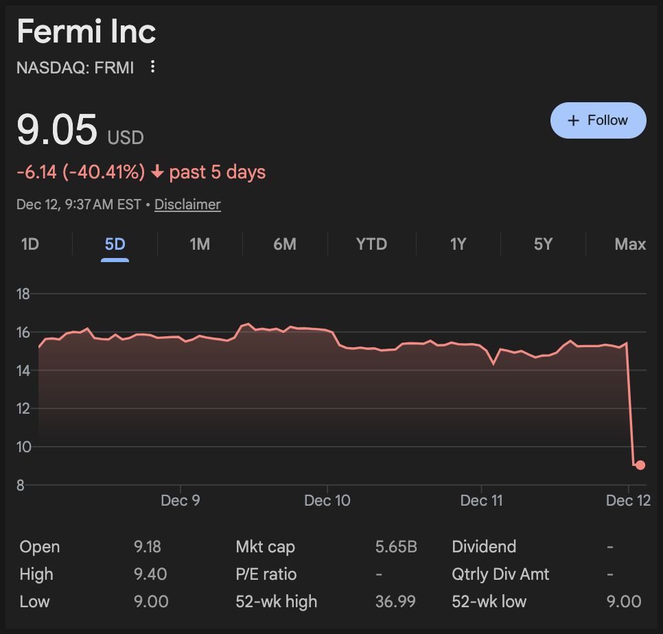 그런데 12월 12일 현재 미국 주식 시장이 오픈하자마자 실시간으로 40% 폭락하고 있습니다. 페르미 아메리카가 추진 중인 초대형 프로젝트에 있어 현실적 난관이 제대로 드러난 사건이 터졌기 때문이죠.