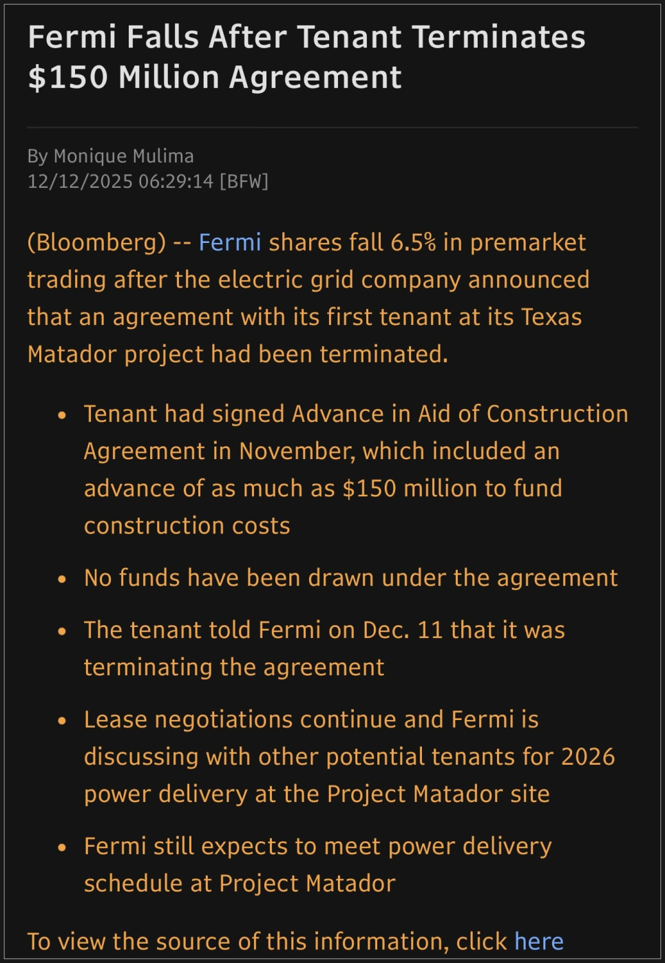 이번에 파장을 일으킨 소식은 페르미의 첫 잠재 임차인과 맺었던 건설 지원 선급금 계약(AICA)이 종료됐다는 점입니다. 이 계약은 임차인이 페르미 아메리카의 프로젝트 마타도르 초기 공사를 위해 최대 1억 5천만 달러를 지원할 수 있는 구조였습니다. 쉽게 말해, 첫 임차인이 처음부터 ‘돈을 얹어주며’ 캠퍼스 공사를 시작하게 해주는 형태였죠.