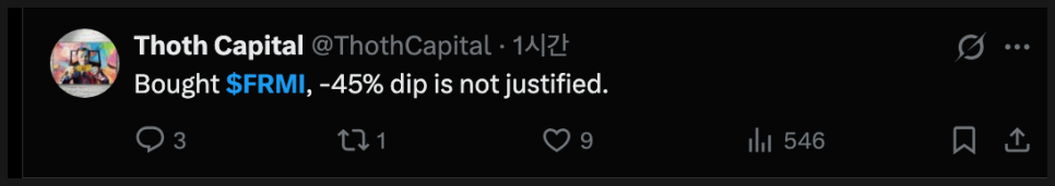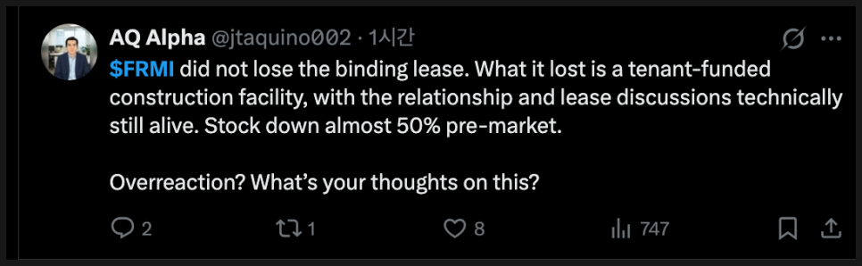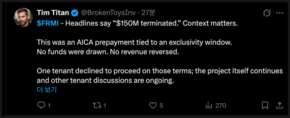 정리하자면, 현재의 FRMI는 기술적으로 매우 위험한 가격대에 위치하고 있으며, 단기적으로는 공포심리가 계속 시장을 흔들 가능성이 높습니다. 하지만 동시에, 기업 자체의 방향성이 완전히 꺾인 상황은 아니라는 점에서 향후 뉴스와 자금 조달 흐름에 따라 예상보다 빠르게 반등 신호가 나올 가능성도 열려 있습니다. 지금은 주가와 차트만 보고 판단하기보다는, 회사의 임차인 계약, 전력 공급 일정, 새 펀딩 구조 재정비 같은 펀더멘털 이벤트가 어떻게 이어지느냐를 조금 더 면밀히 지켜봐야 하는 시점이라고 판단됩니다.