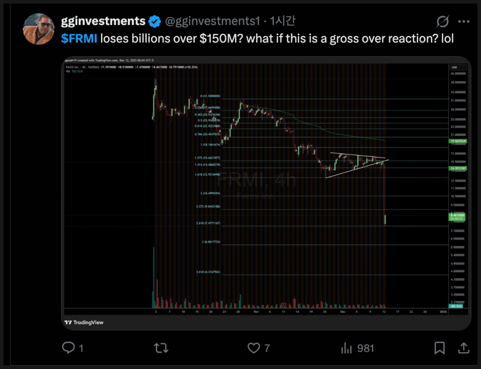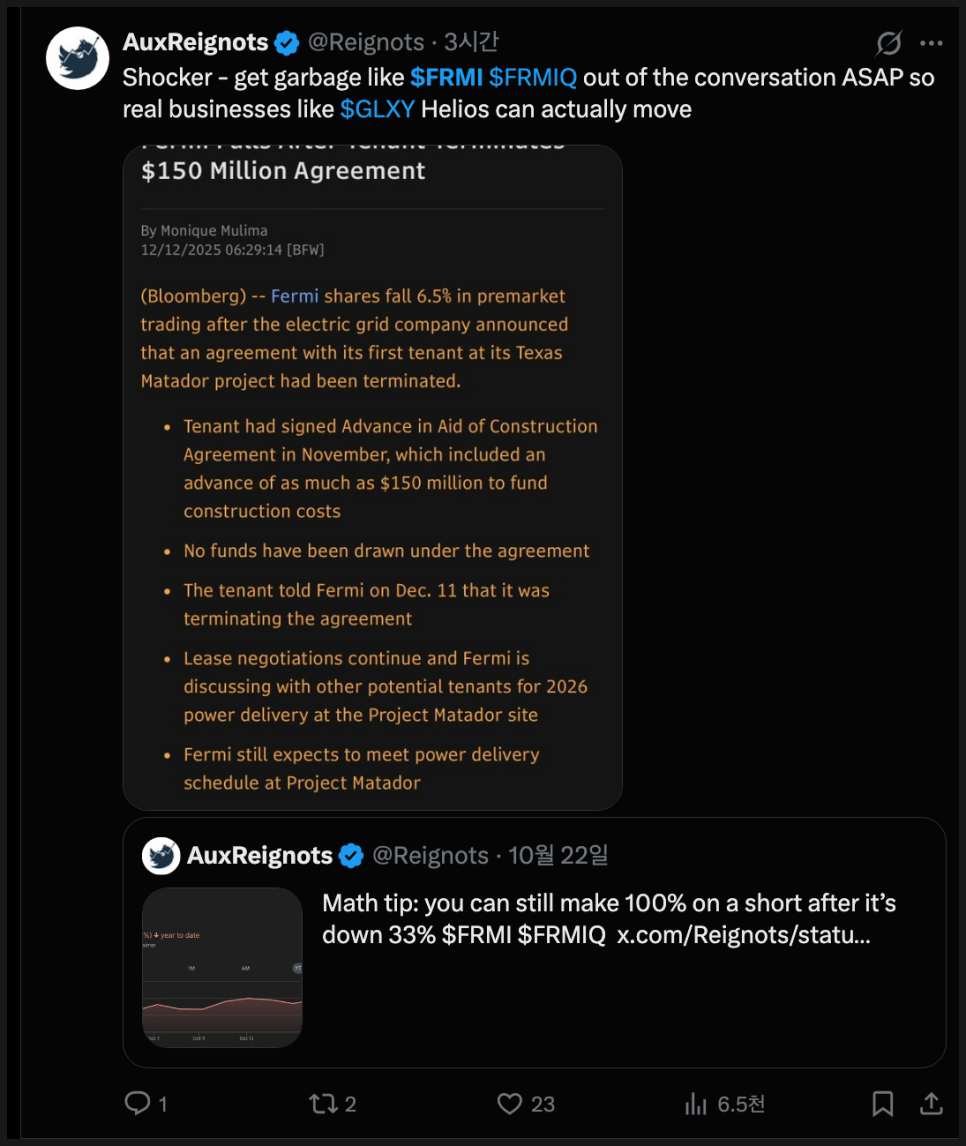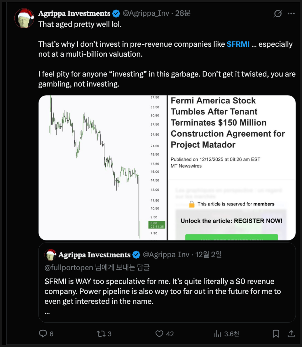 먼저 부정적인 반응부터 살펴보면, 일부 투자자들은 이번 사태를 두고 “예상된 결과”라고 단언하고 있습니다. 예를 들어 위 계정은 “그래서 나는 매출도 없는 프리레베뉴 기업에는 투자하지 않는다. 특히 페르미 아메리카처럼 매출 하나 없이 수십억 달러의 가치를 붙인 기업은 더더욱 그렇다”고 지적했습니다. 이 투자자는 “이건 투자가 아니라 도박이다”라고 단언하면서, 이번 폭락을 오히려 경고의 증거로 삼고 있습니다.