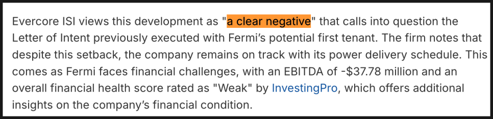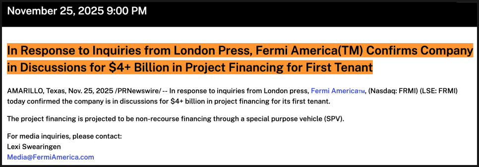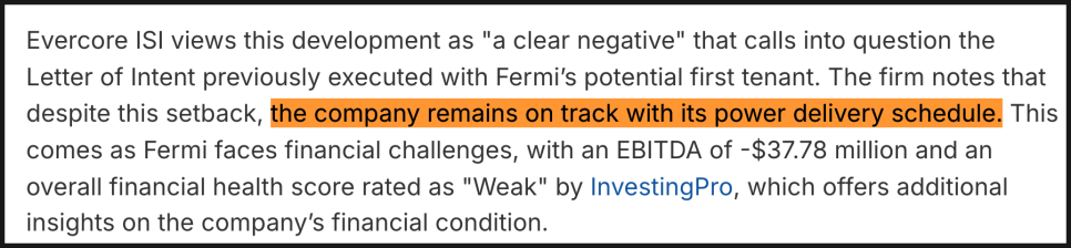여기에 더해, 불과 몇 주 전에는 첫 임차인과 40억 달러 규모의 프로젝트 파이낸싱 논의가 진행 중이라는 소식도 있었습니다. 이번 AICA 종료가 이러한 대형 자금 논의까지 무산됐다는 의미는 꼭 아닐 수 있는데요. 다만 초기 자금 조달의 구성 자체가 예상보다 유동적이며, 페르미 아메리카가 더 폭넓은 잠재 임차인과 자금 파트너를 확보해야 한다는 점이 분명해졌다고 봐야겠습니다. 회사 측은 2026년 전력 공급 시점을 목표로 여러 다른 기업들과 논의를 진행 중이라고 설명했습니다.
