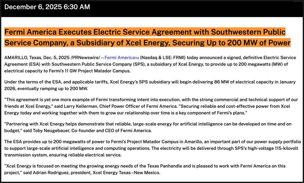 페르미 아메리카는 차세대 AI 기업과 초고성능 컴퓨팅 기업을 위해 기가와트급 전력을 자체적으로 공급할 수 있는 초대형 민간 에너지 그리드를 구축하겠다는 대담한 비전을 내세우며 초기부터 주목을 받았습니다. 10월에 상장하면서 개인 투자자들의 관심도 받았었죠.