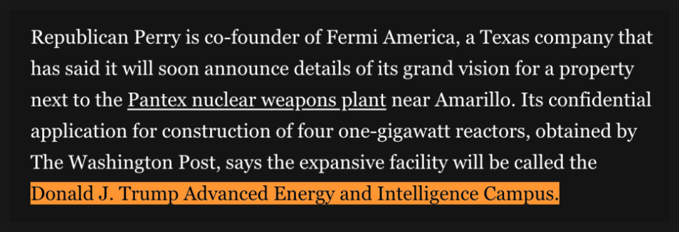 사실 페르미 아메리카(Fermi America)의 상장 과정에서 꾸준히 언급됐던 키워드 중 하나가 바로 “트럼프(Trump)”였습니다. 이 회사가 가진 내러티브에는 에너지 정책, 원자력 인프라, AI 경쟁력이라는 산업적 요소뿐 아니라, 정치가 강하게 얽혀 있습니다. 창업자인 릭 페리(Rick Perry)가 트럼프 1기 행정부의 에너지부 장관 출신이라는 점,