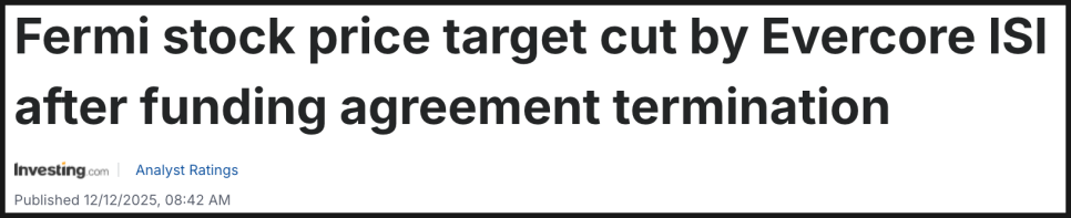 애널리스트의 반응도 빠르게 뒤따랐습니다. 에버코어 ISI(Evercore ISI)는 이번 건설 지원 선급금 계약(AICA) 종료 소식이 나오자마자 페르미 아메리카(Fermi America)의 목표 주가를 기존 37달러에서 20달러로 크게 낮췄습니다. 회사의 사업 구조와 향후 일정에 대한 신뢰도를 다시 평가한 결과라고 볼 수 있습니다.