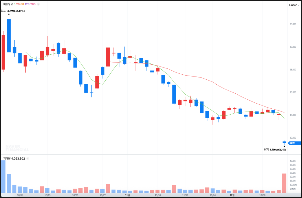 특히 11월 초 이후부터 이동평균선 위로 올라가지 못한 채 계속 눌리는 모습이 반복됐습니다. 이동평균선은 많은 투자자들이 참고하는 심리선인데요, 이 선을 지속적으로 회복하지 못한다는 것은 수급이 반등의 근거를 찾지 못하고 있다는 뜻입니다. 가격이 잠깐 올라오는 듯한 순간에도 거래량이 크게 붙지 않았고, 다시 하락이 나타날 때만 거래량이 늘어나는 모습이 반복됐습니다. 이런 패턴은 흔히 매물이 위에서 덮치고 있다는 신호로 받아들여집니다.