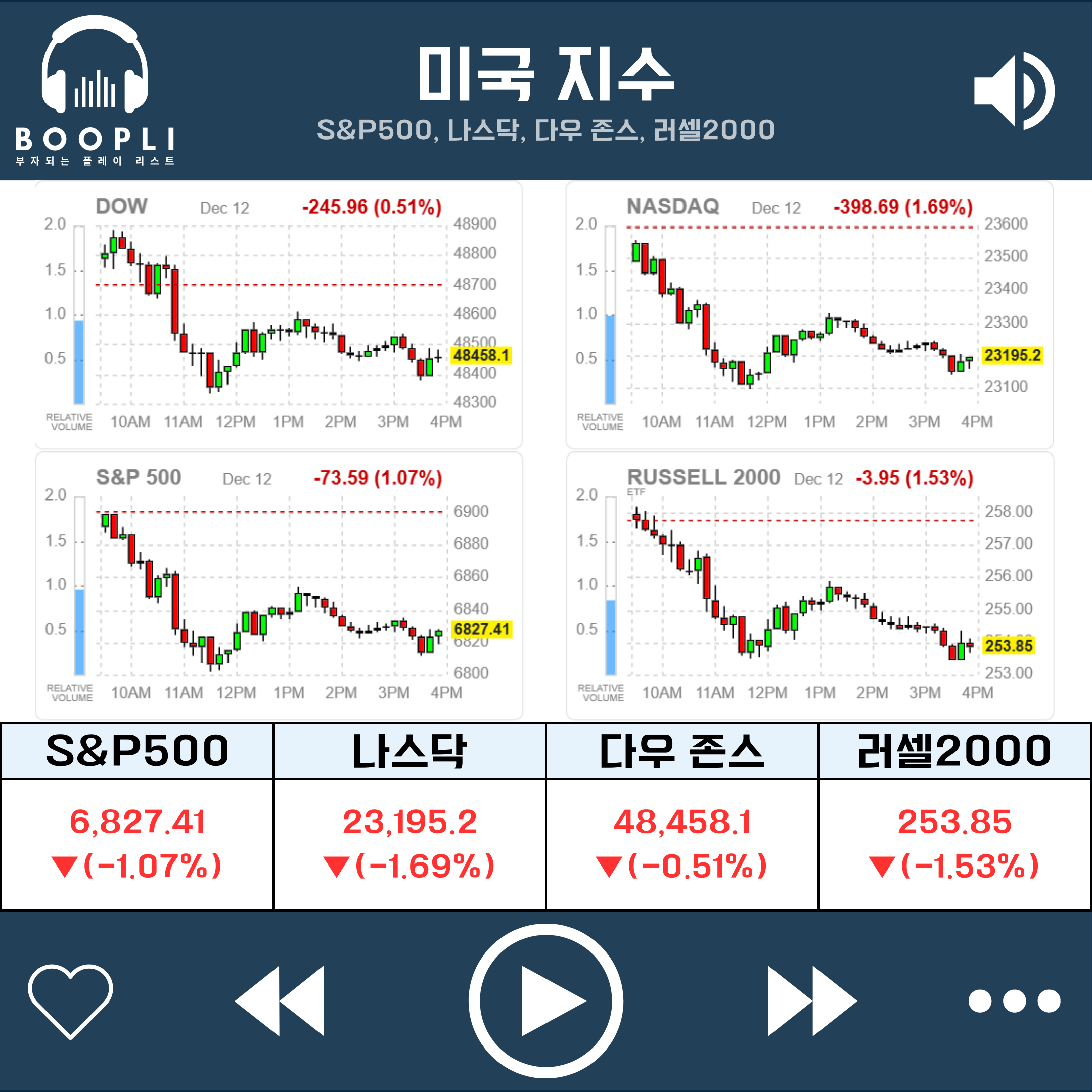 전일 미국 증시는 브로드컴·오라클발 AI 수익성 및 인프라 지연 우려와 국채 금리 상승이 동시에 투자 심리를 압박하며 다우(-0.51%), S&P500(-1.07%), 나스닥(-1.69%), 러셀2000(-1.53%) 등 4대 지수 모두 하락 마감