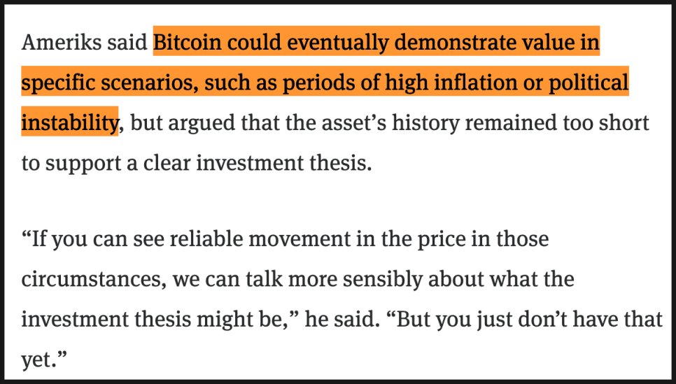 아메릭스는 뉴욕에서 열린 블룸버그 ETF 컨퍼런스에서 비트코인은 장기 투자에 필요한 현금 흐름이나 복리 구조가 부족하다고 지적했습니다. 그는 아직까지 블록체인 기술이 안정적인 경제적 가치를 만든다는 증거도 명확하지 않다고 말했죠.