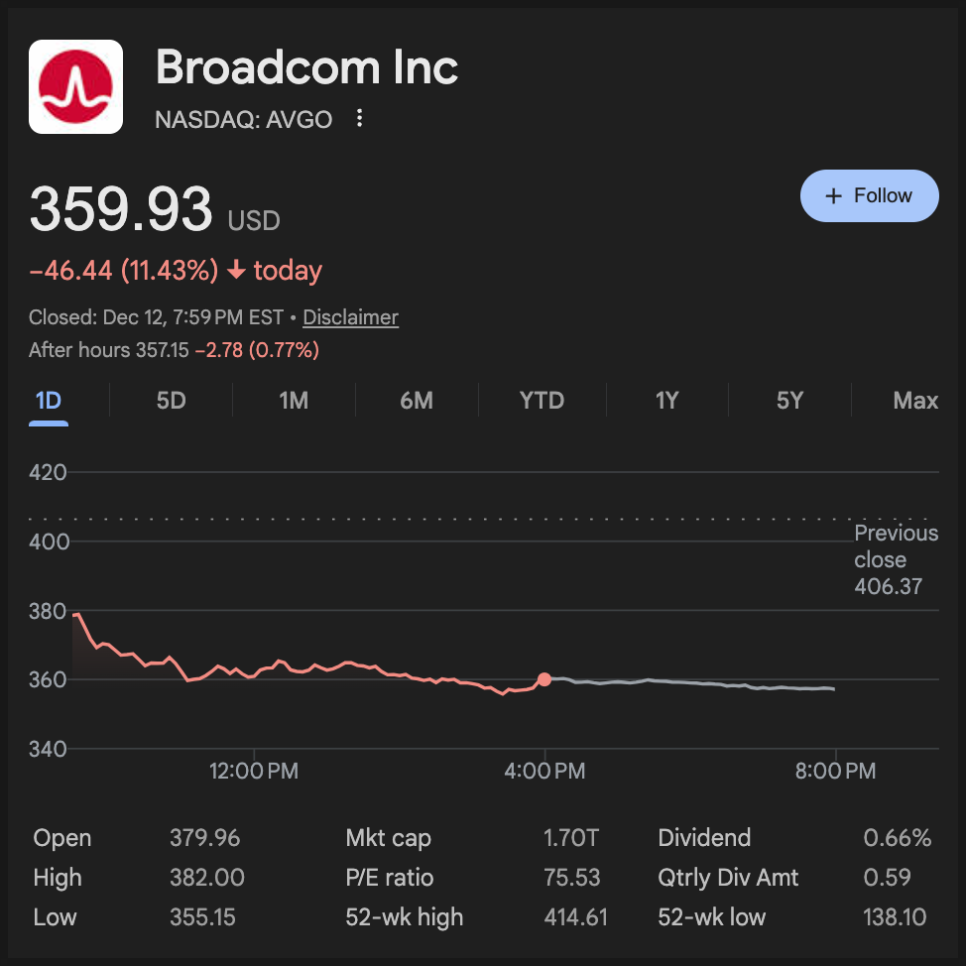 게다가 반도체 기업 브로드컴(AVGO)이 시장 분위기를 크게 눌러버렸습니다. 시가총액 기준으로도 미국 상위권에 드는 기업인데, 실적 자체는 좋았지만 앞으로의 전망이 투자자 기대에 못 미쳤다는 이유로 주가가 하루 만에 10퍼센트나 떨어졌습니다. 아무리 좋은 실적이라도 기대치가 너무 높으면 이런 식으로 시장이 반응하곤 하죠.