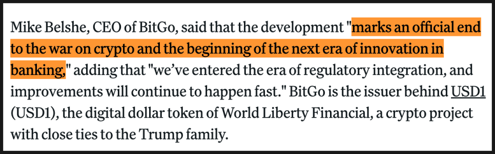 비트고(BitGo)의 CEO 마이크 벨시(Mike Belshe)는 “이제 미국에서 암호화폐와 은행 사이의 전쟁은 끝났다”고 표현하며, 은행·암호화폐가 하나의 규제 틀 안으로 들어오는 ‘통합의 시대’가 시작됐다고 말했습니다.
