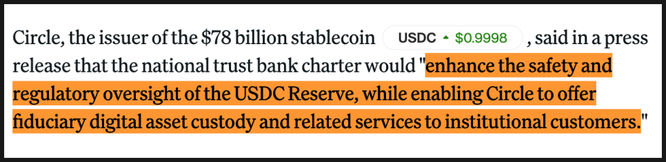 서클도 비슷한 의견을 냈습니다. 서클은 780억 달러 규모 스테이블코인 USDC를 발행하는 기업인데요. 연방 신탁은행 지위를 통해 준비금의 안전성이 강화되고, 기관 고객을 위한 보관·신탁 서비스도 더 명확한 규제 틀 안에서 제공할 수 있다고 밝혔습니다.