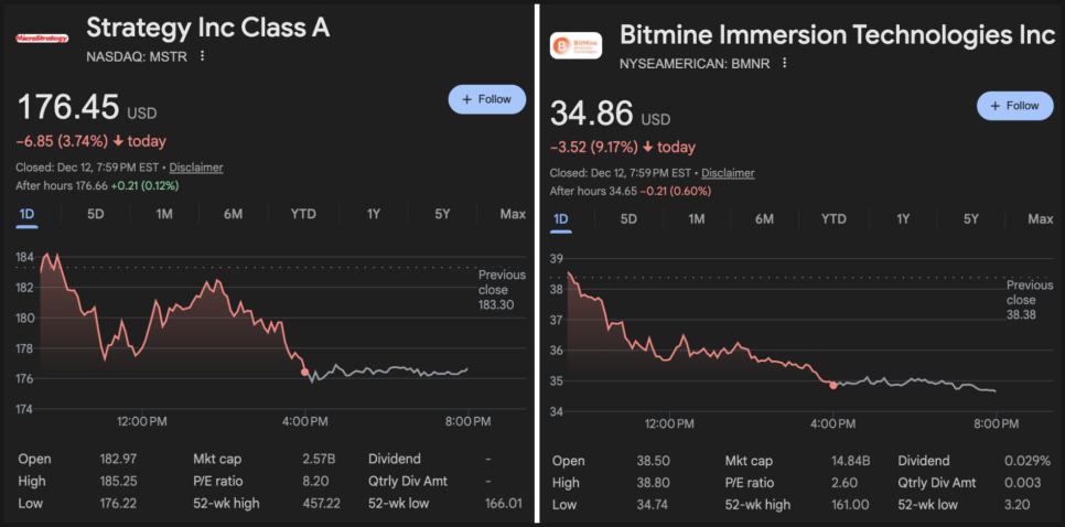 스트래티지(MSTR), 비트마인(BMNR) 같은 DAT 기업들 주가도 하락했고,
